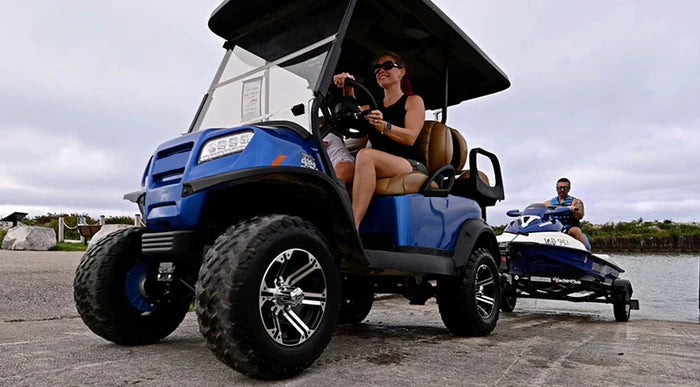 Perfect for cottagers and trailer park enthusiasts, our Discovery 4 wheel drive system transforms your existing golf cart into a true off-road electric vehicle. Take on sandy beaches and muddy trails while still enjoying the ease of your golf cart. Now, you can use your golf cart to comfortably tow your favorite toys to the water.